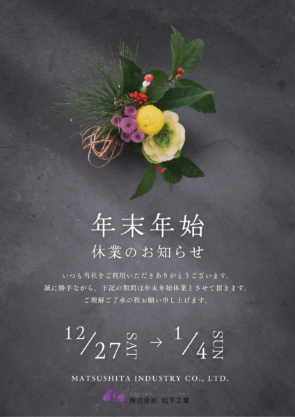 株式会社松下工業では、誠に勝手ながら下記の期間を年末年始休業とさせていただきます。